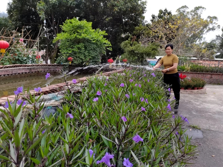惠城區(qū)江南街道七聯(lián)村村民紀(jì)金秋在自家小院澆花。