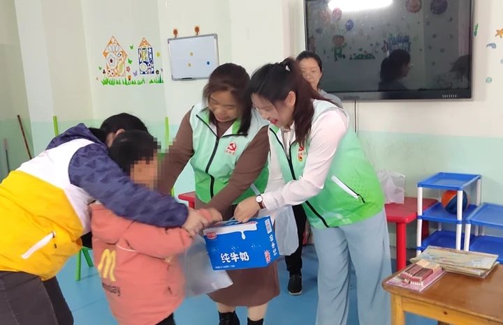 志愿者給“星孩”贈(zèng)送慰問(wèn)物資及學(xué)習(xí)用品。