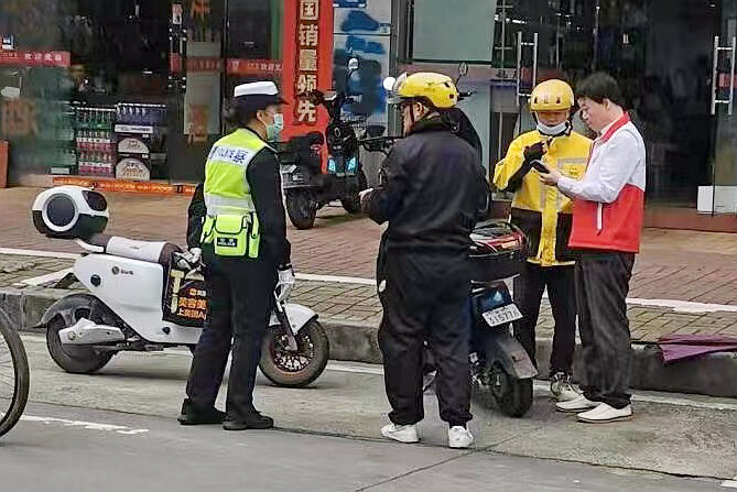 正在路邊開展志愿服務(wù)活動(dòng)的江北街道退役軍人志愿者周鄂良看見后,立即飛奔到外賣小哥身邊開展救助,“你怎么了?你醒醒。”“警察同志,這邊有人暈倒了!彼瑫r(shí)呼叫正在路邊執(zhí)勤的輔警。輔警看到后,立即鳴哨并示意正在行駛的車輛慢行,在遠(yuǎn)處擺放雪糕筒指揮車輛繞行并把電動(dòng)車扶起來。在路邊巡查的江北云山社區(qū)工作人員張惠容看到后,也加入到救助行列。