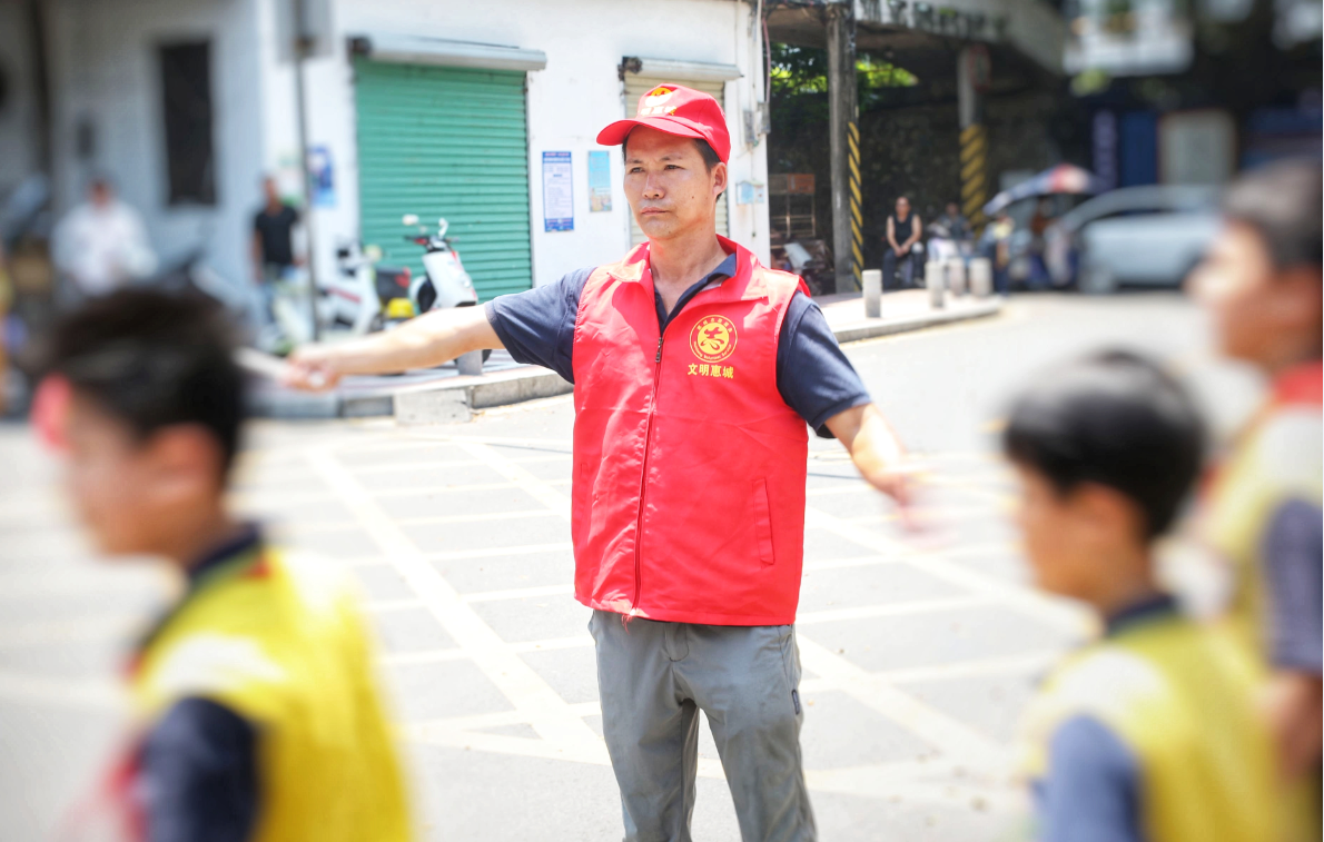 學(xué)校在新民街旁,新民街是環(huán)島通道之一,每天上學(xué)放學(xué)時(shí)段孩子進(jìn)出校門,存在著交通安全隱患,也易造成車輛堵塞。深受志愿服務(wù)精神感染的張景錢,牽頭成立了惠城區(qū)楊桃樹志愿服務(wù)隊(duì),“護(hù)航”師生上學(xué)放學(xué)路。