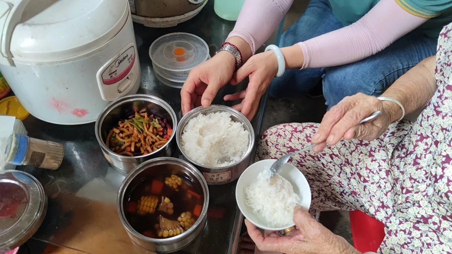 中午11時許,送餐志愿者劉麗敏剛把飯放下來,就發(fā)現(xiàn)93歲的徐奶奶滿身大汗,于是幫她換衣服,打開風扇,然后擰開不銹鋼飯盒蓋,把湯盛到碗里。