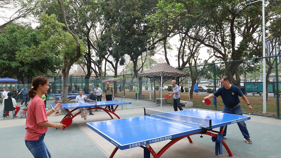 市民享受家門口運動便利,在市區(qū)東平公園打乒乓球。