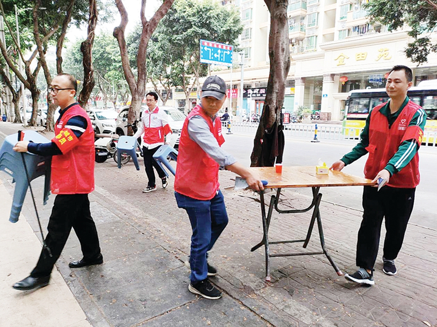 文明城市督導員協(xié)助商戶整理占道物品。 惠州日報記者謝菁菁 通訊員李曉雪 攝