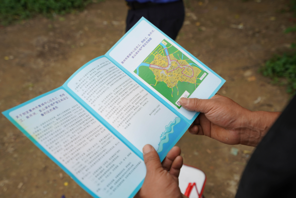 執(zhí)法人員向垂釣人員派發(fā)宣傳手冊引導文明垂釣。惠州日報記者湯渝杭 攝