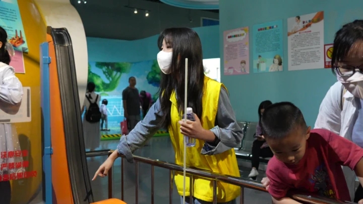 19歲的黃祖桐也是利用假期來做志愿服務的,她負責的是“生命科學”展區(qū),這里有多個互動項目,吸引許多小朋友來體驗,人多的時候黃祖桐就要不停走動維持秩序,還要提醒孩子們文明參與,不要爭搶。“一天7個小時基本上都要不停走動,也是挺累的。”黃祖桐說,但是能幫助到別人,看到大家玩得開心,自己也覺得開心。