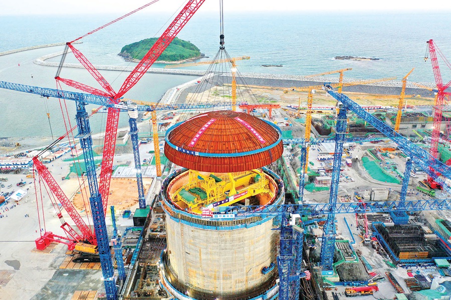 太平嶺核電2號(hào)機(jī)組穹頂?shù)跹b現(xiàn)場(chǎng)。惠州日?qǐng)?bào)記者馮麗均 攝