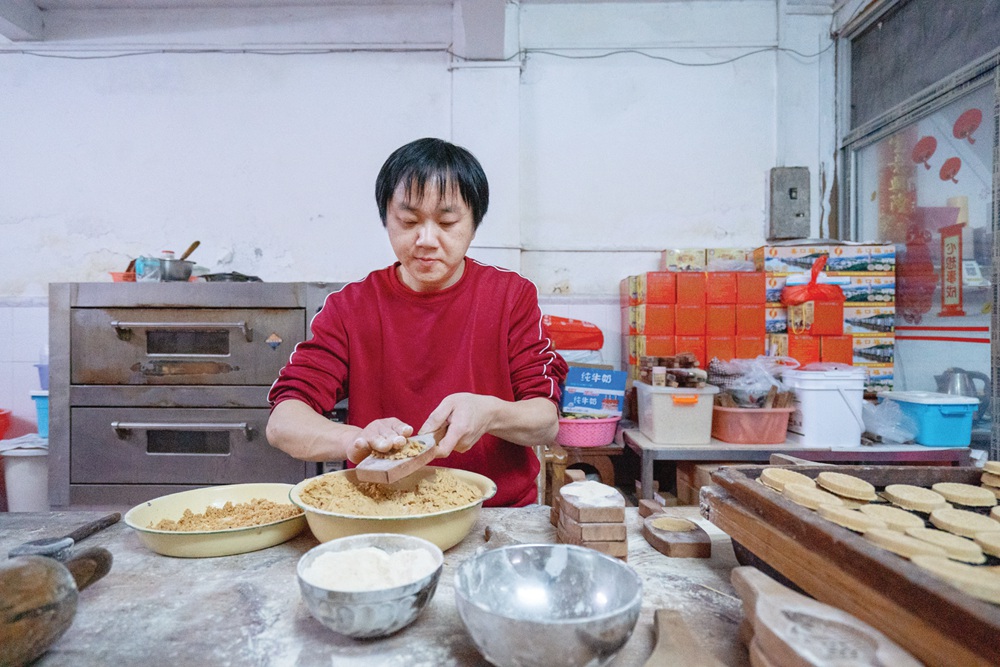 從谷行街轉(zhuǎn)進(jìn)賣(mài)籮街,狹窄的街道里,臨近傍晚,餅香飄出,餅?zāi)G么蚵暣似鸨朔。米餅師傅羅偉亮用一雙巧手,數(shù)十年如一日用古法制作出一個(gè)個(gè)富有寓意的龍門(mén)米餅。“臨近過(guò)年的時(shí)候訂單增加了許多,主要都是老街坊想在過(guò)年的時(shí)候買(mǎi)米餅送親朋!睂⒋竺追粗两瘘S、碾成米粉,加上糖膠和成米粉團(tuán),加入芝麻、花生等餡料,然后用木制模具碾壓后倒出,最后將米餅放入烤爐中烤制……作為龍門(mén)米餅制作技藝的非物質(zhì)文化遺產(chǎn)傳承人,羅偉亮每天打餅十多個(gè)小時(shí)。羅偉亮說(shuō),龍門(mén)米餅皮薄餡多、咸淡適中、清香宜人,一直廣受人們歡迎。除了口味吸引人們之外,龍門(mén)米餅還寄托了人們對(duì)美好生活的追求。龍門(mén)人做米餅用的模具上刻的通常是牡丹花或是一些吉利的詞匯,如“喜”“!薄皦邸钡,寓意對(duì)親友的美好祝福。