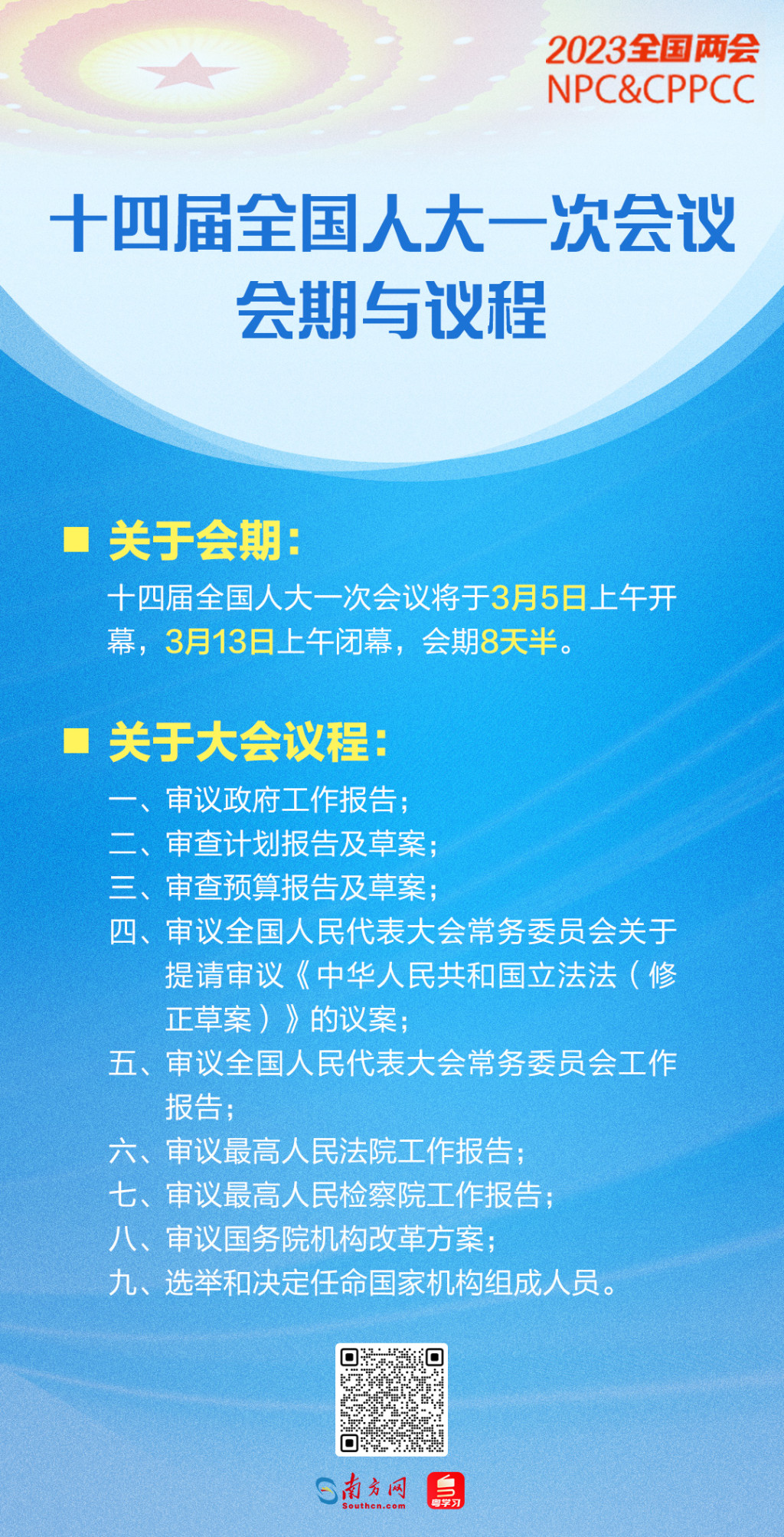 十四屆全國(guó)人大一次會(huì)議3月5日上午開(kāi)幕 會(huì)期8天半 共有9項(xiàng)議程