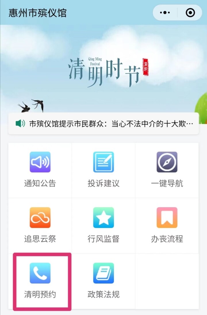 記者看到,目前“惠州市殯儀館”微信公眾號已開通“清明預(yù)約”欄目,并顯示該預(yù)約通道將于2023年3月23日開放。市民也可以通過“惠州民政”微信公眾號,點(diǎn)擊“便民服務(wù)-祭掃預(yù)約”進(jìn)行預(yù)約。