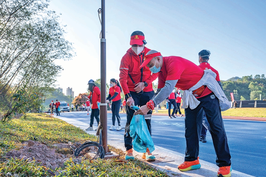 志愿者們?cè)诩ち骺铀畮?kù)桃花源休閑運(yùn)動(dòng)生態(tài)公園撿跑。惠州東江圖片社供圖
