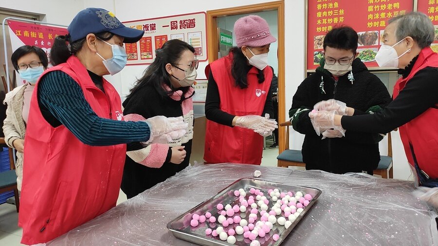 銀齡志愿者們帶領(lǐng)居民一起制作湯圓。