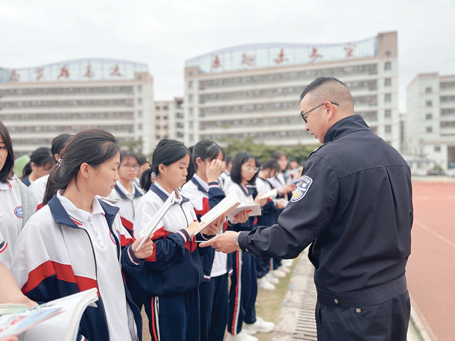 活動現(xiàn)場向?qū)W生發(fā)放普法手冊。 惠州日報記者黃尉宏 通訊員黃雯婷 攝