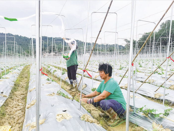 車村村村民正在地里給苦瓜苗牽藤。 惠州日?qǐng)?bào)記者湯渝杭 攝