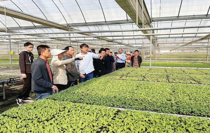 “水培大棚一畝地可擺放10個(gè)水培架,每畝一次大概能產(chǎn)2400斤左右,夏天1500斤左右。水培葉菜類(黃金快菜)一般上架27天后可采摘,一年可以循環(huán)12次,一個(gè)月一次……”在蔬菜有機(jī)基質(zhì)綠色水培示范區(qū)里,代表們圍在惠州市智慧未來(lái)農(nóng)業(yè)科技有限公司總經(jīng)理黃國(guó)順身邊,興致勃勃地聆聽(tīng)他對(duì)此次觀摩會(huì)主栽品種——黃金快菜日常管理、產(chǎn)量和效益的介紹。