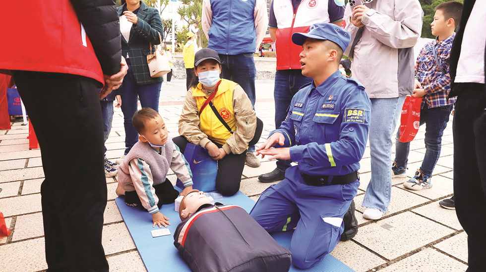 學(xué)雷鋒志愿服務(wù)集市上,志愿者正在為市民演示心肺復(fù)蘇。
