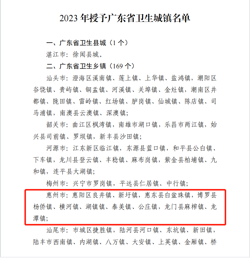 惠州日報訊 (記者李春鳳 通訊員楊華坤)近日,由廣東省愛國衛(wèi)生運動委員會發(fā)布的“2023年廣東省衛(wèi)生城鎮(zhèn)名單”出爐,共評審出廣東省衛(wèi)生縣城1個、廣東省衛(wèi)生鄉(xiāng)鎮(zhèn)169個,其中惠州10個鄉(xiāng)鎮(zhèn)入列廣東省衛(wèi)生鄉(xiāng)鎮(zhèn)榜單。