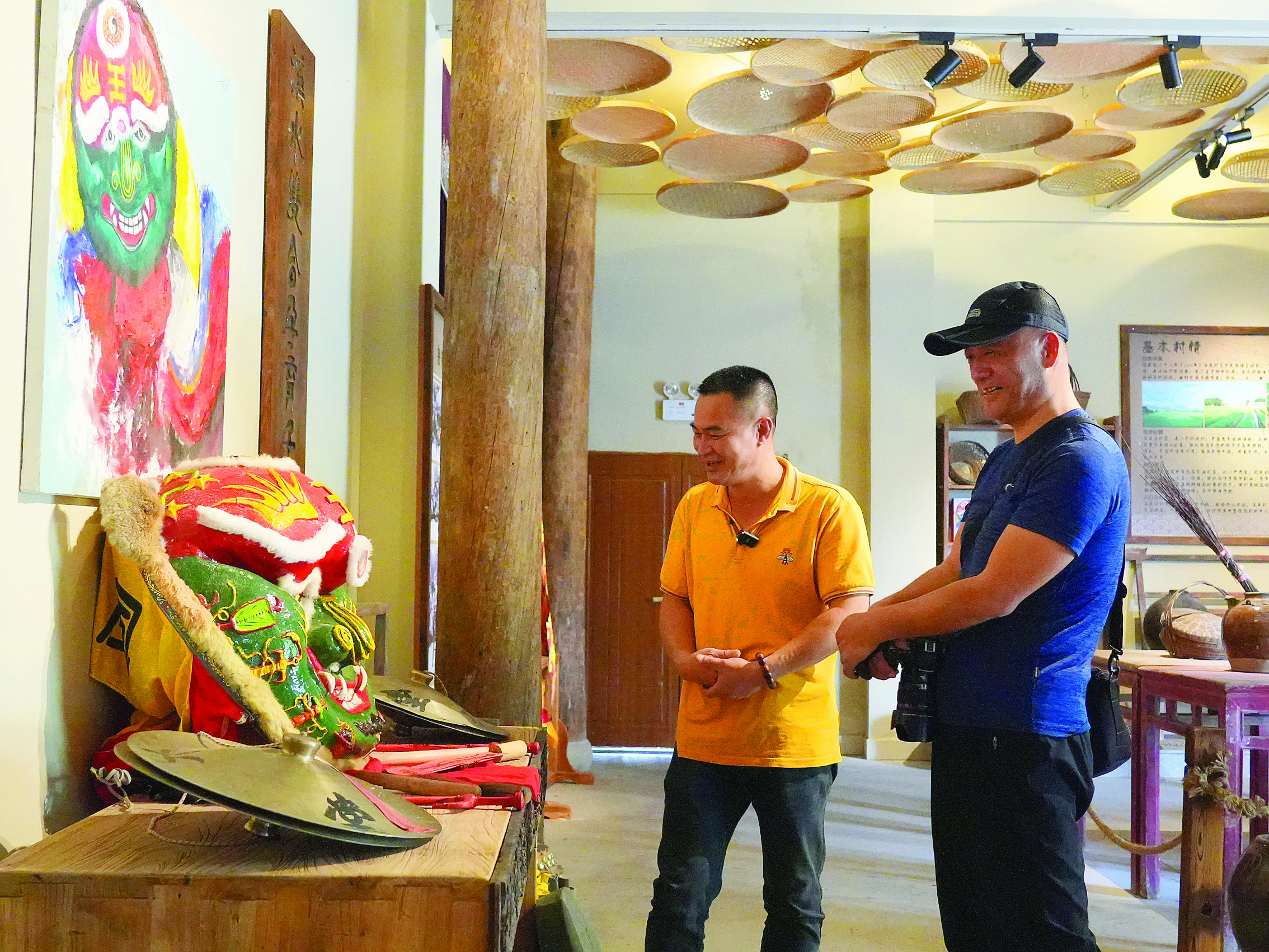 走進(jìn)溪美村史館,首先映入眼簾的是正中間的蓋子獅彩畫,栩栩如生;旁邊是一副上書“溪水雙合孕育千秋桑梓 美德長(zhǎng)存福澤百世子孫”的對(duì)聯(lián);下方的展臺(tái)擺放著造型獨(dú)特的蓋子獅獅頭,格外顯眼。環(huán)顧四周,隨處可見(jiàn)農(nóng)耕老物件,如鋤頭、籮筐、犁耙、石磨、谷風(fēng)機(jī)等農(nóng)具,以及帶有年代感的桌椅、廚具等藏品近200件。