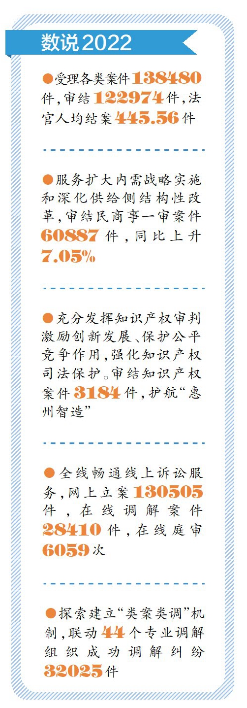 “2022年全市法院緊扣奮力躋身全省前列的工作目標(biāo),在服務(wù)大局、司法為民、公正司法、隊(duì)伍建設(shè)等方面取得新發(fā)展、新成效。”2月7日,惠州市中級(jí)人民法院(以下簡稱“惠州中院”)黨組書記、院長朱可勝在惠州市第十三屆人民代表大會(huì)第三次會(huì)議上作法院工作報(bào)告。據(jù)統(tǒng)計(jì),2022年惠州法院共受理各類案件138480件,審結(jié)122974件,法官人均結(jié)案445.56件。
