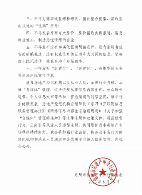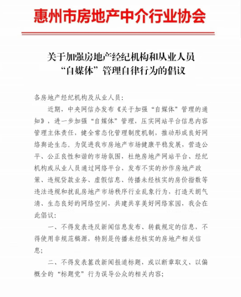 日前,記者從惠州市住房和城鄉(xiāng)建設(shè)局獲悉,在該局指導(dǎo)下,惠州市房地產(chǎn)中介行業(yè)協(xié)會正式發(fā)布《關(guān)于加強(qiáng)房地產(chǎn)經(jīng)紀(jì)機(jī)構(gòu)和從業(yè)人員“自媒體”管理自律行為的倡議》(以下簡稱《自律倡議》),倡議共同構(gòu)建天朗氣清、生態(tài)良好的網(wǎng)絡(luò)空間,為惠州房地產(chǎn)市場健康平穩(wěn)發(fā)展?fàn)I造公平、公正良性和諧的市場氛圍。
