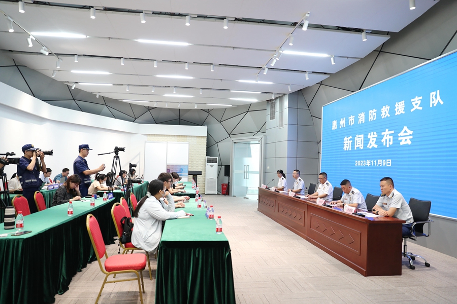 11月9日上午,惠州市人民政府新聞辦公室新聞發(fā)布廳舉行“高質(zhì)量發(fā)展看惠州”系列主題新聞發(fā)布會(huì)第6場(chǎng)之“惠州消防這五年”新聞發(fā)布會(huì),就惠州消防改革這五年來取得的成績(jī)和群眾關(guān)心的熱點(diǎn)話題進(jìn)行介紹和解讀,并回答記者提問;葜菔邢谰仍ш(duì)副支隊(duì)長(zhǎng)田創(chuàng)明等出席發(fā)布會(huì)。南方日?qǐng)?bào)、羊城晚報(bào)、廣東廣播電視臺(tái)、南方都市報(bào)、廣州日?qǐng)?bào)、深圳特區(qū)報(bào)、香港商報(bào)、惠州日?qǐng)?bào)、惠州市廣播電視臺(tái)、今日惠州網(wǎng)等十余家媒體記者參加發(fā)布會(huì)。