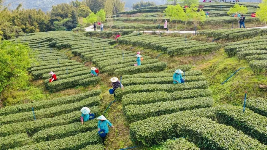 龍門地派茶園里,茶農(nóng)采摘茶葉。