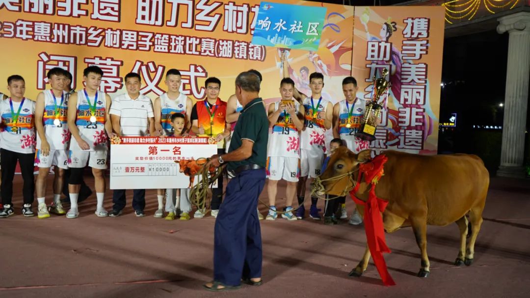 近段時(shí)間,“村BA”成為惠州鄉(xiāng)村一大盛事!皵y手美麗非遺 助力鄉(xiāng)村振興”2023年惠州市鄉(xiāng)村男子籃球賽在各縣(區(qū))開(kāi)展了選拔賽,現(xiàn)場(chǎng)氛圍火爆,頒獎(jiǎng)環(huán)節(jié)更是吸睛:博羅湖鎮(zhèn)選拔賽的冠軍獲得健壯的黃牛一頭,黃牛在現(xiàn)場(chǎng)“走秀”一圈,憨態(tài)可掬;龍門龍?zhí)锕凇、季軍的?jiǎng)品,不僅有龍?zhí)镦?zhèn)兩大省級(jí)現(xiàn)代農(nóng)業(yè)產(chǎn)業(yè)園的絲苗米、胡須雞活雞,還有在當(dāng)?shù)厥卟朔N植基地剛采摘下來(lái)的大冬瓜、西瓜等,可謂是村味十足、“土”得地道。