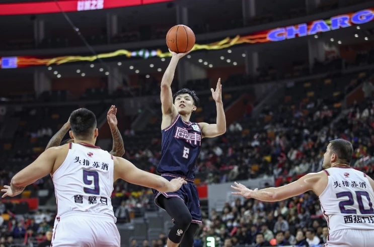 廣東隊(duì)球員徐杰(中)在CBA常規(guī)賽比賽中投籃。圖片來源:新華社