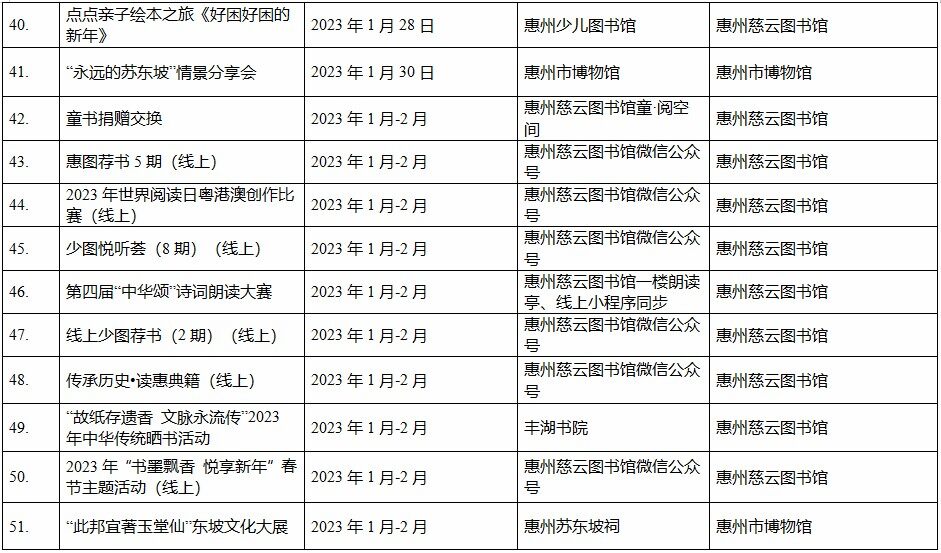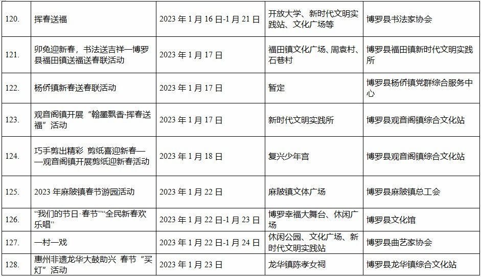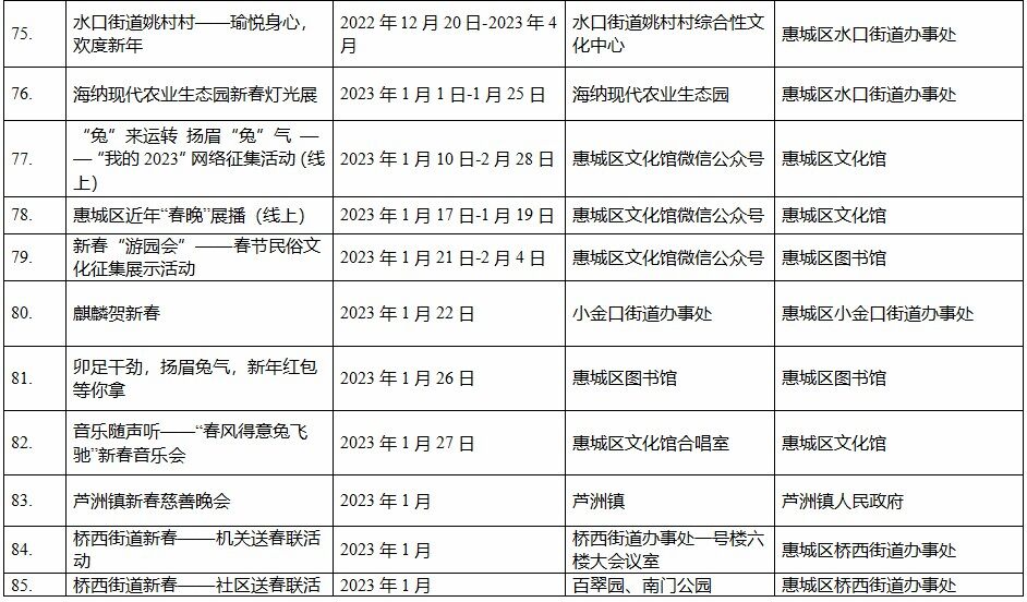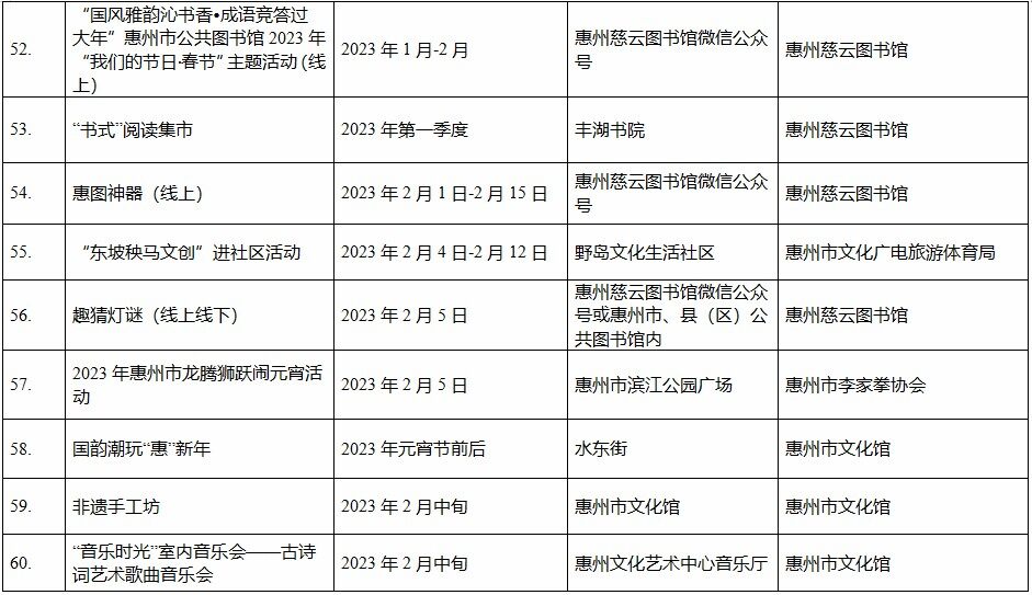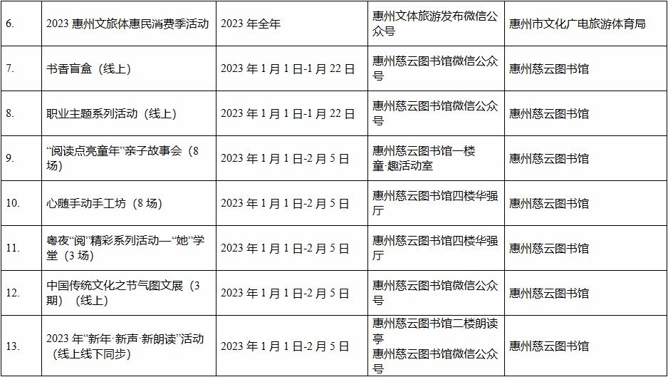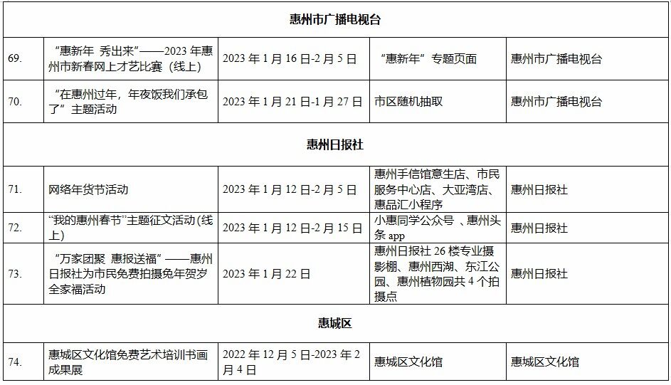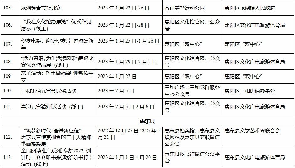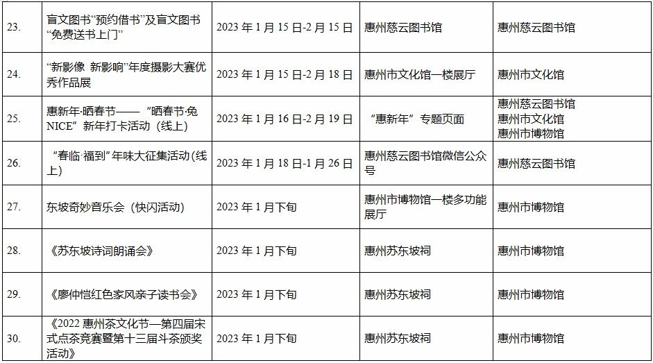 到各大公共文化場館打卡、參加線上線下各類文化活動、感受傳統(tǒng)中國年味、云上賞戲劇……1月15日,記者從市委宣傳部獲悉,“惠新年”——2023年惠州市新春文化進萬家活動將于1月16日全面啟動;顒訉⒊掷m(xù)到2月19日,覆蓋整個農(nóng)歷新年,惠州市委宣傳部將統(tǒng)籌組織各縣(區(qū))、市直宣傳文化單位力量,開展逾170場主題線上線下活動,進一步營造喜慶、團結(jié)、祥和的節(jié)慶氛圍,讓廣大市民游客在惠過年游得舒心、玩得盡興。