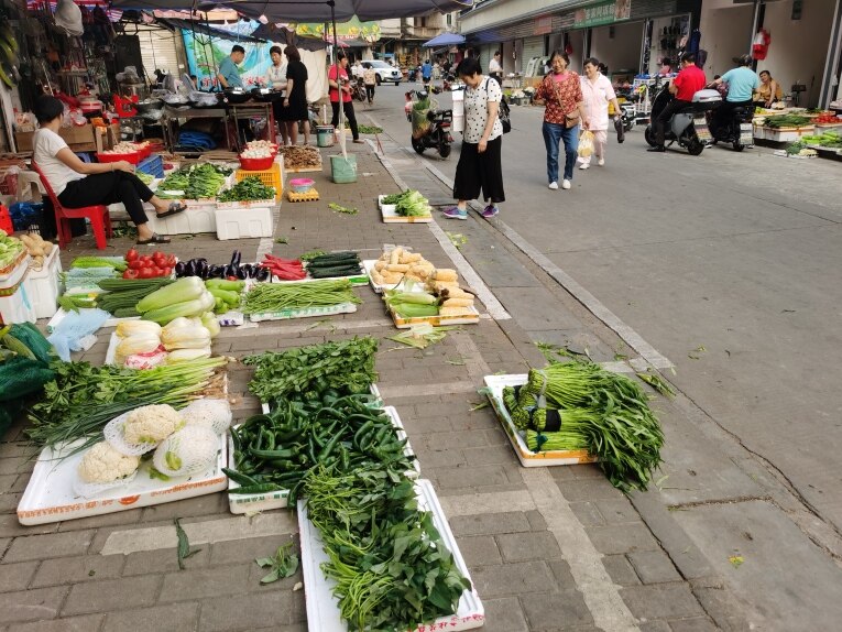 4月17日18時(shí)06分,在惠城區(qū)河南岸斑樟湖一橫街,商販把蔬菜水果等商品擺在機(jī)動(dòng)車道上。