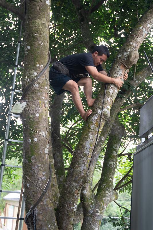 日前,剛走進(jìn)古欖園,記者便聽到陣陣打?yàn)鯔炻。古欖園里有208棵古欖樹,大部分為烏欖,每棵欖樹的樹齡都超過了100年,枝繁葉茂,樹高接近或者超過10米,烏欖就結(jié)在高高的樹上。因此,打?yàn)鯔觳⒉皇且患资拢枰罉洹?