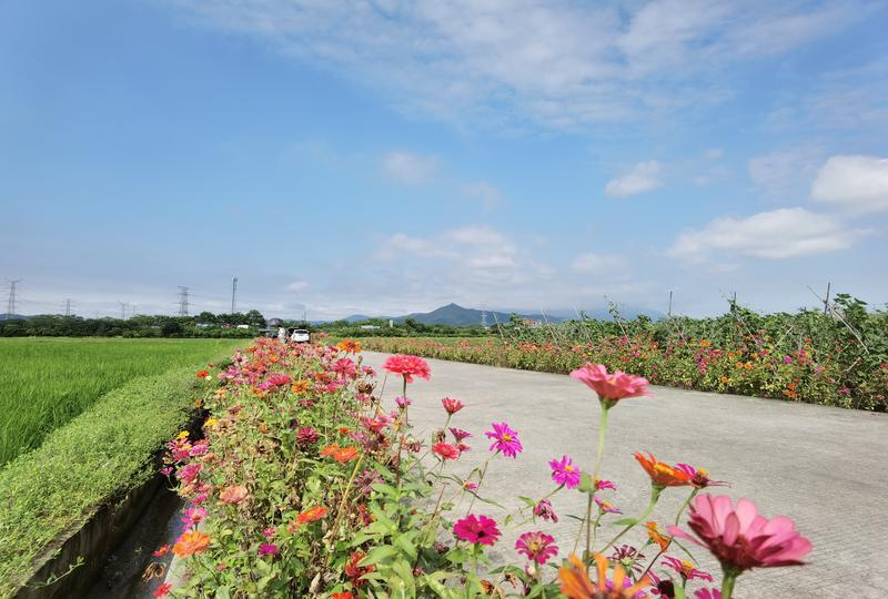 在機(jī)耕路兩旁,各色花兒綻放,迎風(fēng)搖曳,不時還有蜜蜂和蝴蝶在花兒周圍追逐,為這幅美麗的自然畫卷增添了絲絲靈氣。