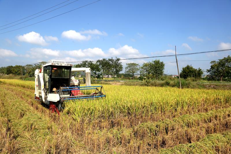 收割機在金色的稻田里來回穿梭;葜萑請笥浾唿S宇翔 特約通訊員黃偉光 攝