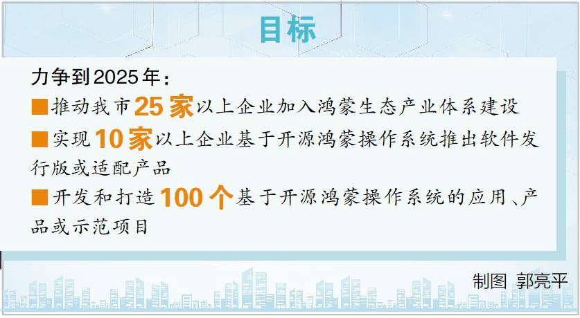 《行動計劃》提出,力爭到2025年,推動我市25家以上企業(yè)加入鴻蒙生態(tài)產(chǎn)業(yè)體系建設(shè),實現(xiàn)10家以上企業(yè)基于開源鴻蒙操作系統(tǒng)推出軟件發(fā)行版或適配產(chǎn)品,開發(fā)和打造100個基于開源鴻蒙操作系統(tǒng)的應(yīng)用、產(chǎn)品或示范項目。