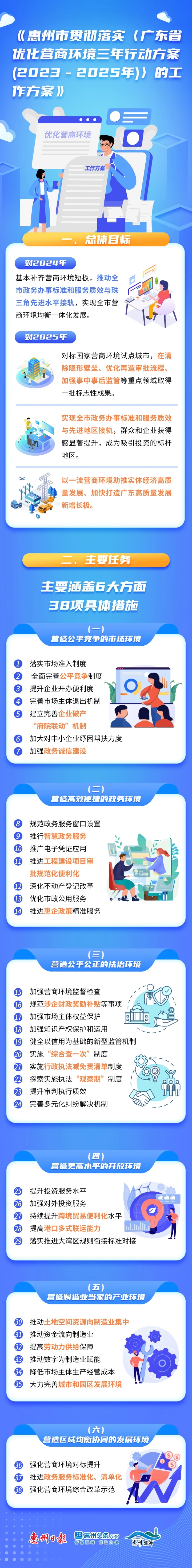 細(xì)化38項(xiàng)具體措施、支持制造業(yè)當(dāng)家、2025年主要指標(biāo)達(dá)到廣深水平……近日,我市出臺(tái)《惠州市貫徹落實(shí)〈廣東省優(yōu)化營商環(huán)境三年行動(dòng)方案(2023-2025年)〉的工作方案》(以下簡稱《工作方案》),從今年開始到2025年,持續(xù)打造穩(wěn)定公平透明、可預(yù)期的營商環(huán)境,建設(shè)統(tǒng)一大市場(chǎng),全力保護(hù)和培育市場(chǎng)主體,更大程度激發(fā)市場(chǎng)主體活力。