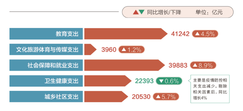 2023年,盡管財政收支壓力很大,但民生投入力度不減。超過27萬億元全國一般公共預算支出中,教育、社會保障和就業(yè)支出都在4萬億元上下,衛(wèi)生健康、城鄉(xiāng)社區(qū)支出都超過了2萬億元。