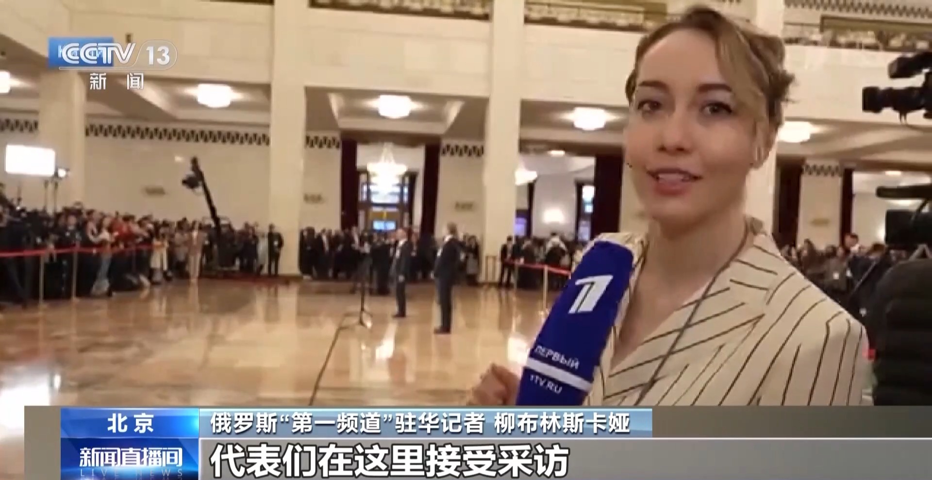 俄羅斯“第一頻道”駐華記者 柳布林斯卡婭:記者太多了,現(xiàn)在記者提問(wèn)席已經(jīng)排成了一排、兩排、三排、四排、五排、六排。代表們?cè)谶@里接受采訪,采訪說(shuō)中文。