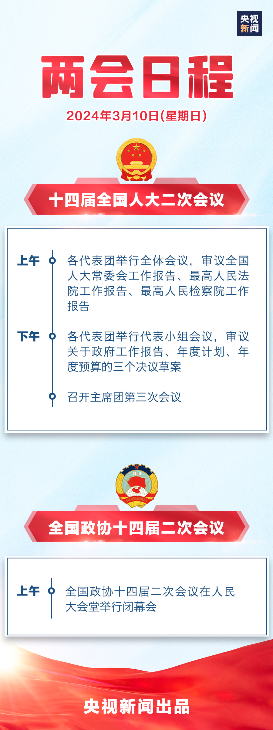 十四屆全國人大二次會議各代表團10日上午舉行全體會議,審議全國人大常委會工作報告、最高人民法院工作報告、最高人民檢察院工作報告。下午,各代表團舉行代表小組會議,審議關(guān)于政府工作報告、年度計劃、年度預(yù)算的三個決議草案;召開主席團第三次會議。