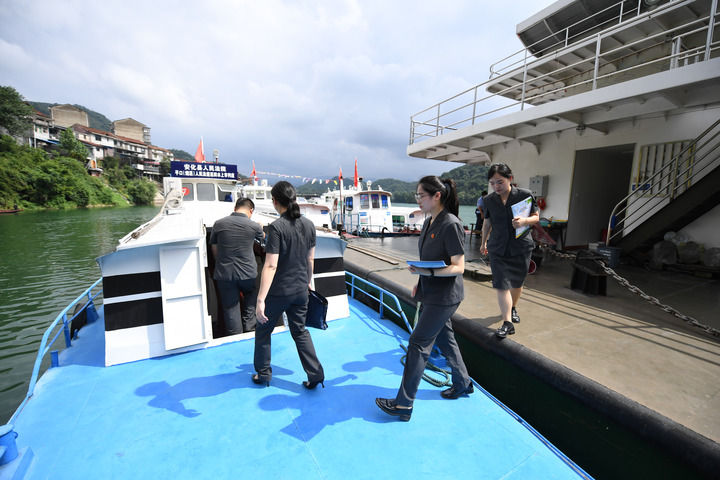 2023年7月19日,湖南省益陽市安化縣人民法院干警在柘溪客運(yùn)碼頭登上“水上法庭”!八戏ㄍァ笨梢蚤_到離當(dāng)事人更近的港口、岸邊,為群眾減輕訴累。新華社記者 薛宇舸 攝