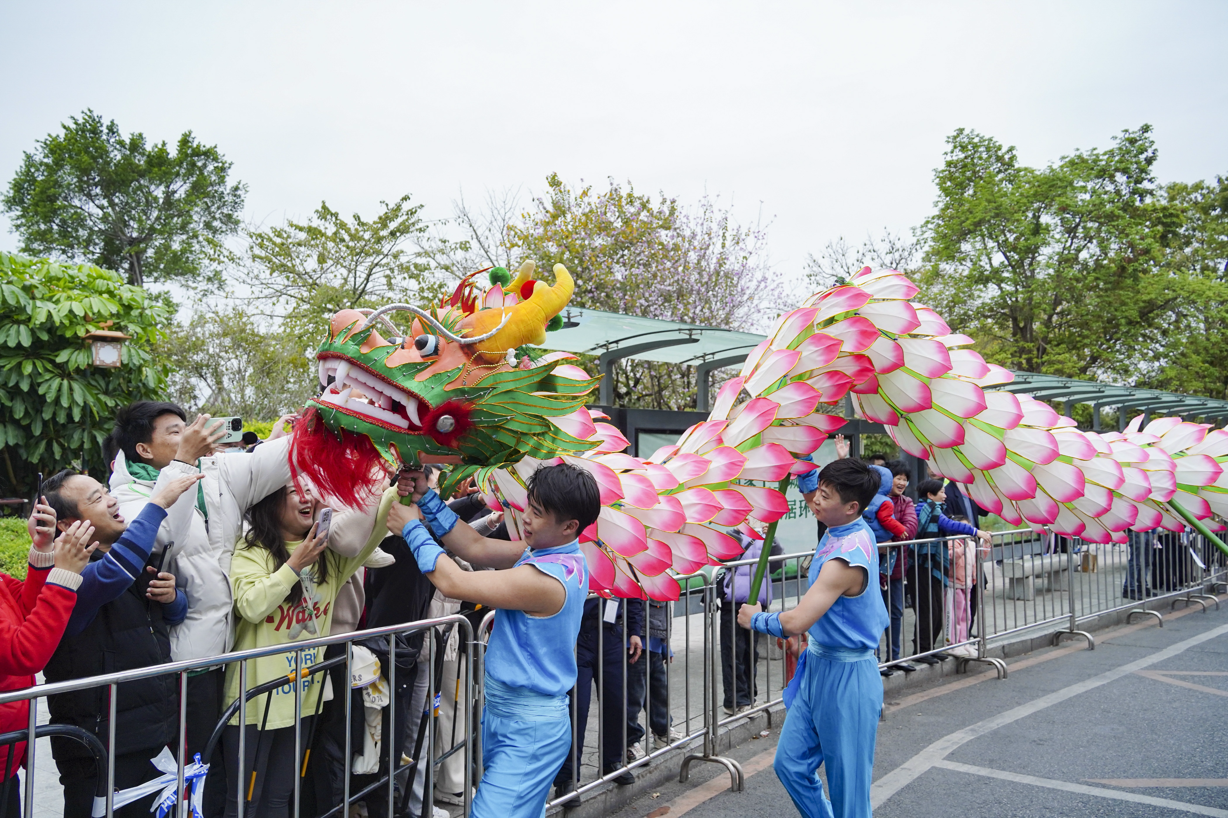 市民與舞龍隊互動。