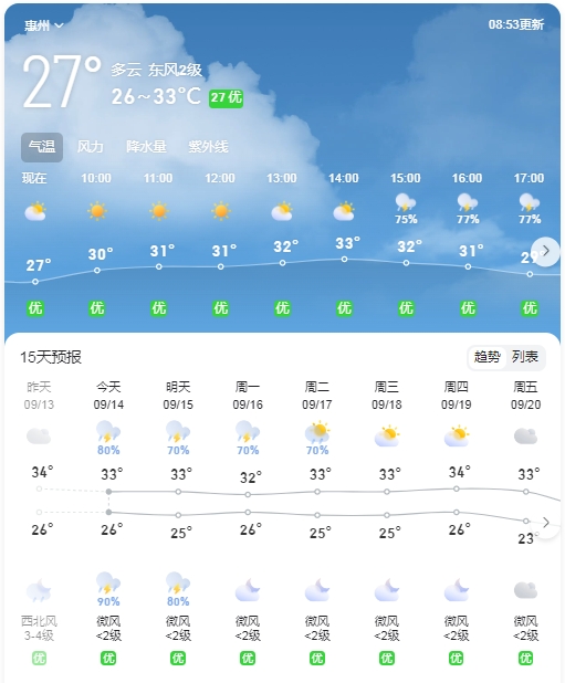 據(jù)惠州市氣象臺預計,中秋假期(15-17日)我市天氣陽光與雷雨相伴,間中雨勢較大;中秋夜部分時段可見月光。