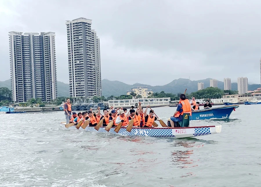連日來,每到下午3點,金門塘碼頭人頭攢動。參加龍舟賽的隊員們在岸邊做好熱身運動,身著整齊的服裝登上龍舟,各就各位!斑诉诉恕庇(xùn)練現(xiàn)場,鼓聲鏗鏘,吆喝聲激昂,劃手們跟隨著鼓點用力奮楫,一艘艘龍舟如離弦之箭在清澈的水面上劈波斬浪,海面上濺起一陣陣雪白的浪花,成為夏日大亞灣畔的一道靚麗風(fēng)景。