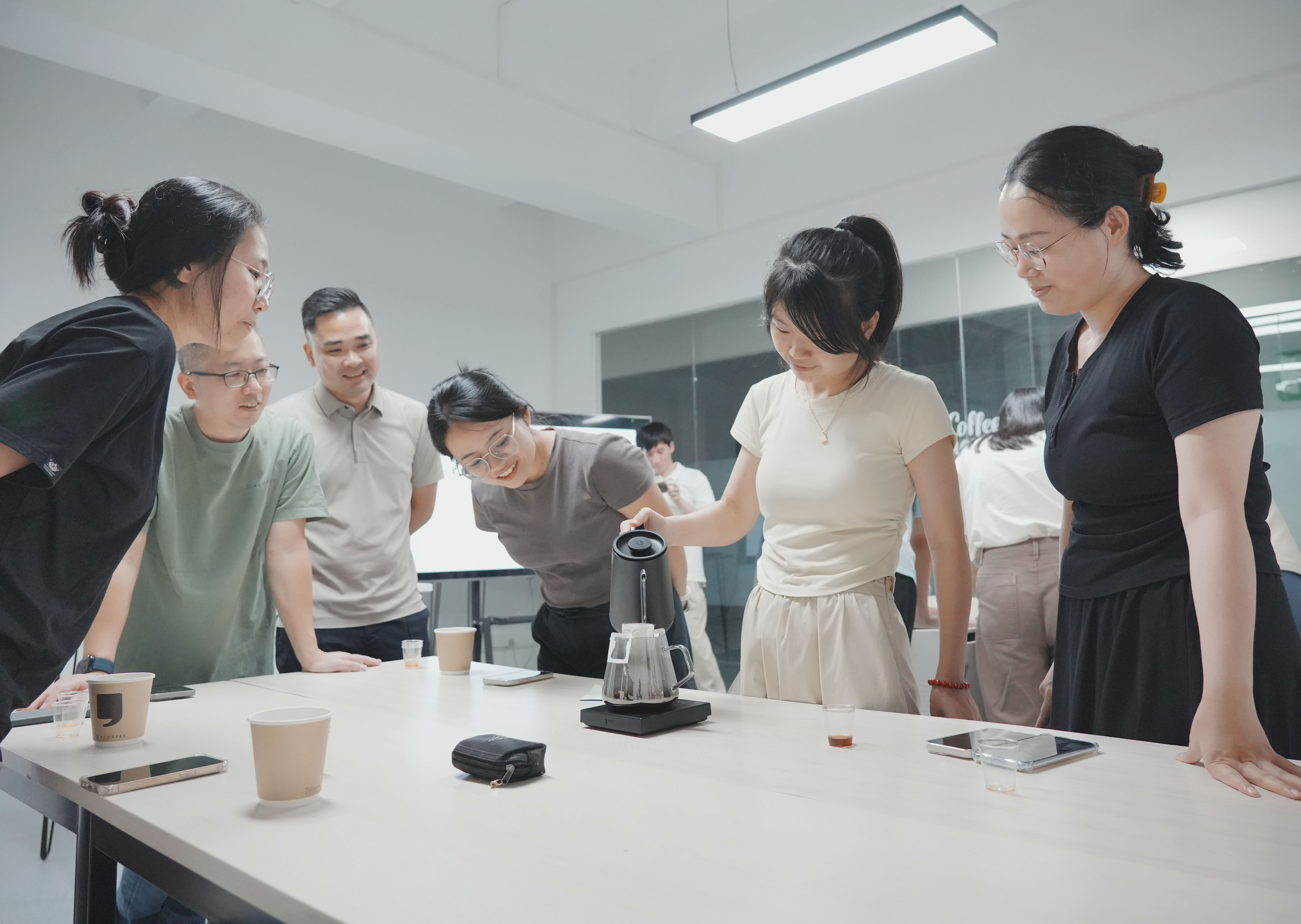 “我們可以通過咖啡杯測來鑒別咖啡的好壞、風(fēng)味,我邀請幾位同學(xué)一起來操作!崩蠋煹脑捯魟偮,扎著馬尾的劉曉芬就舉起了手,興致勃勃地品測咖啡,整堂課上她都十分投入和享受。