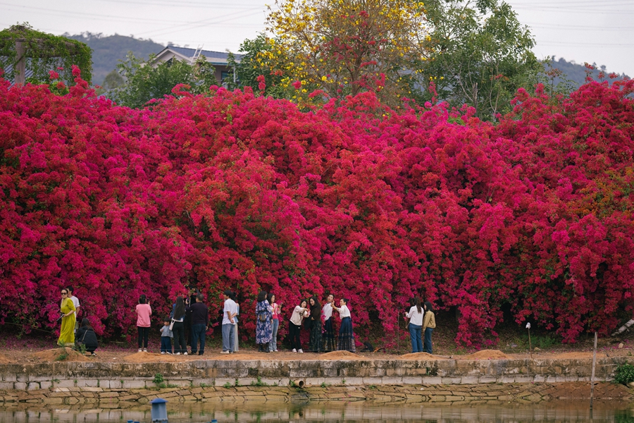 市民在潼湖鎮(zhèn)黃屋村“美麗庭院”示范戶“三角梅瀑布”下打卡(資料圖片);葜萑請笥浾咧荛 攝