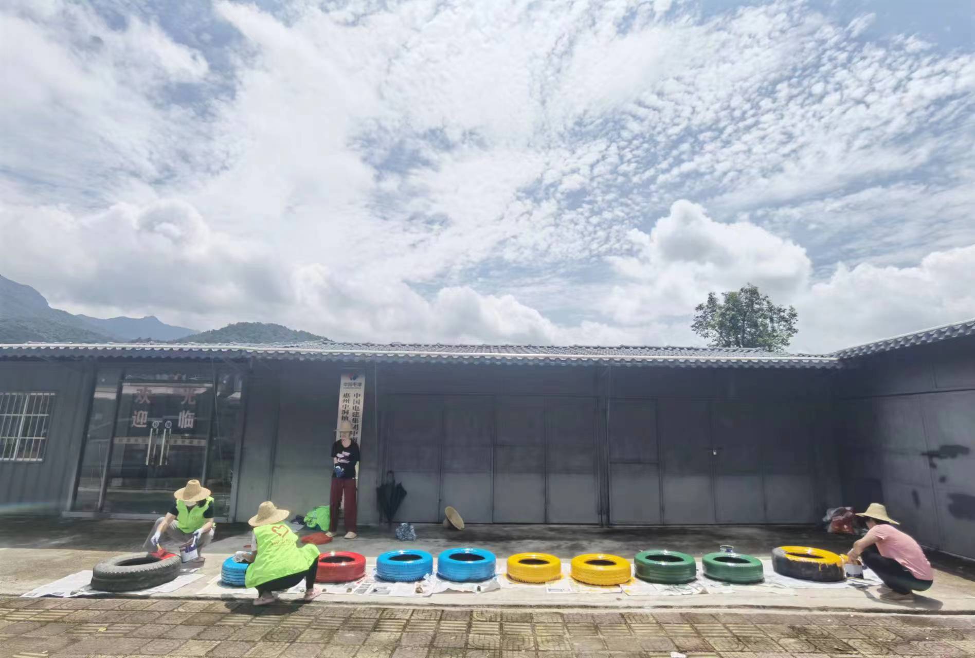 巾幗志愿者利用廢棄輪胎種花。惠州日報記者洪鵲兒 通訊員黃云燕 唐惠嫻 攝