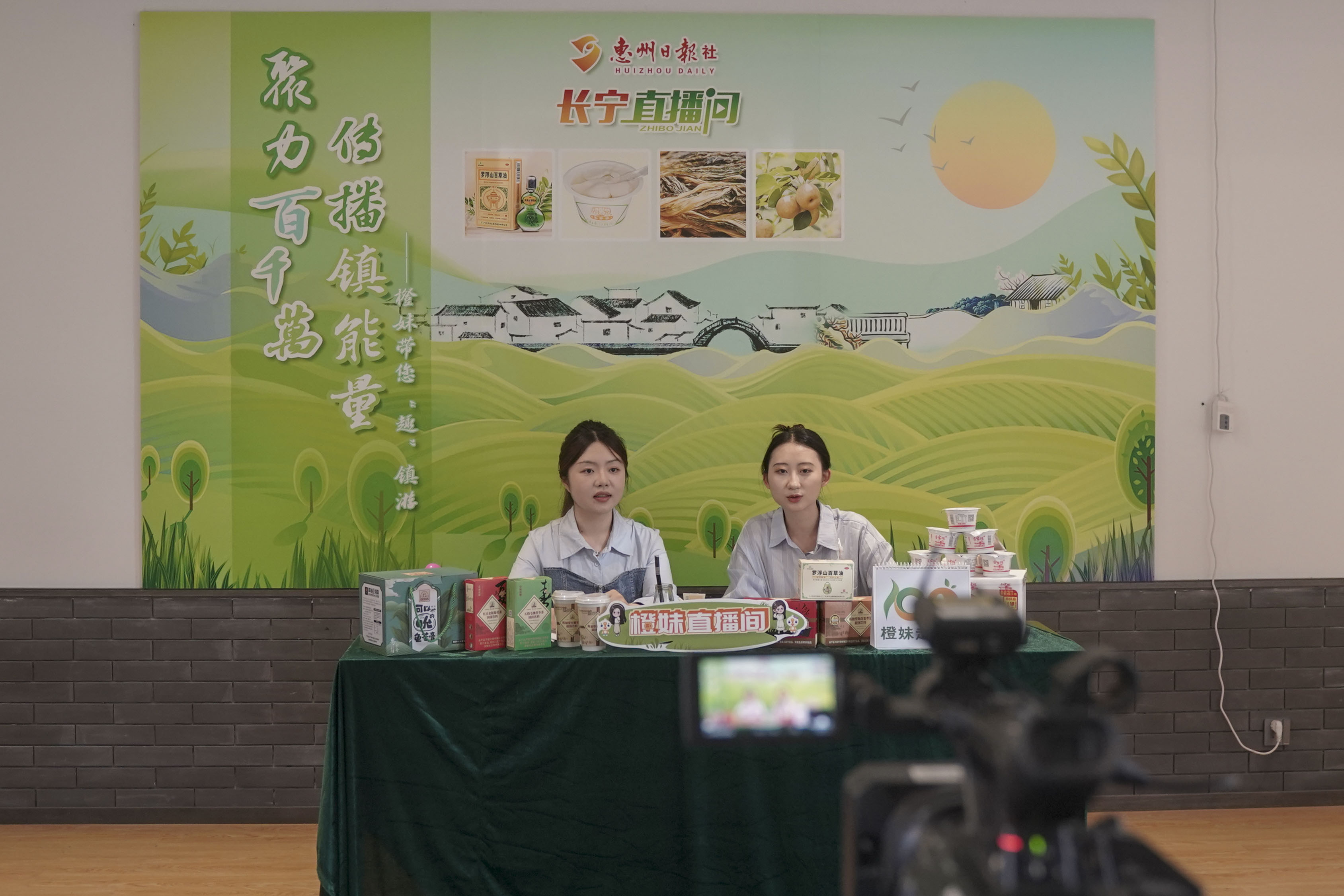 惠州日?qǐng)?bào)社首個(gè)“鎮(zhèn)直播間”長(zhǎng)寧直播間開(kāi)播現(xiàn)場(chǎng);葜萑?qǐng)?bào)記者陳濤 湯渝杭 攝