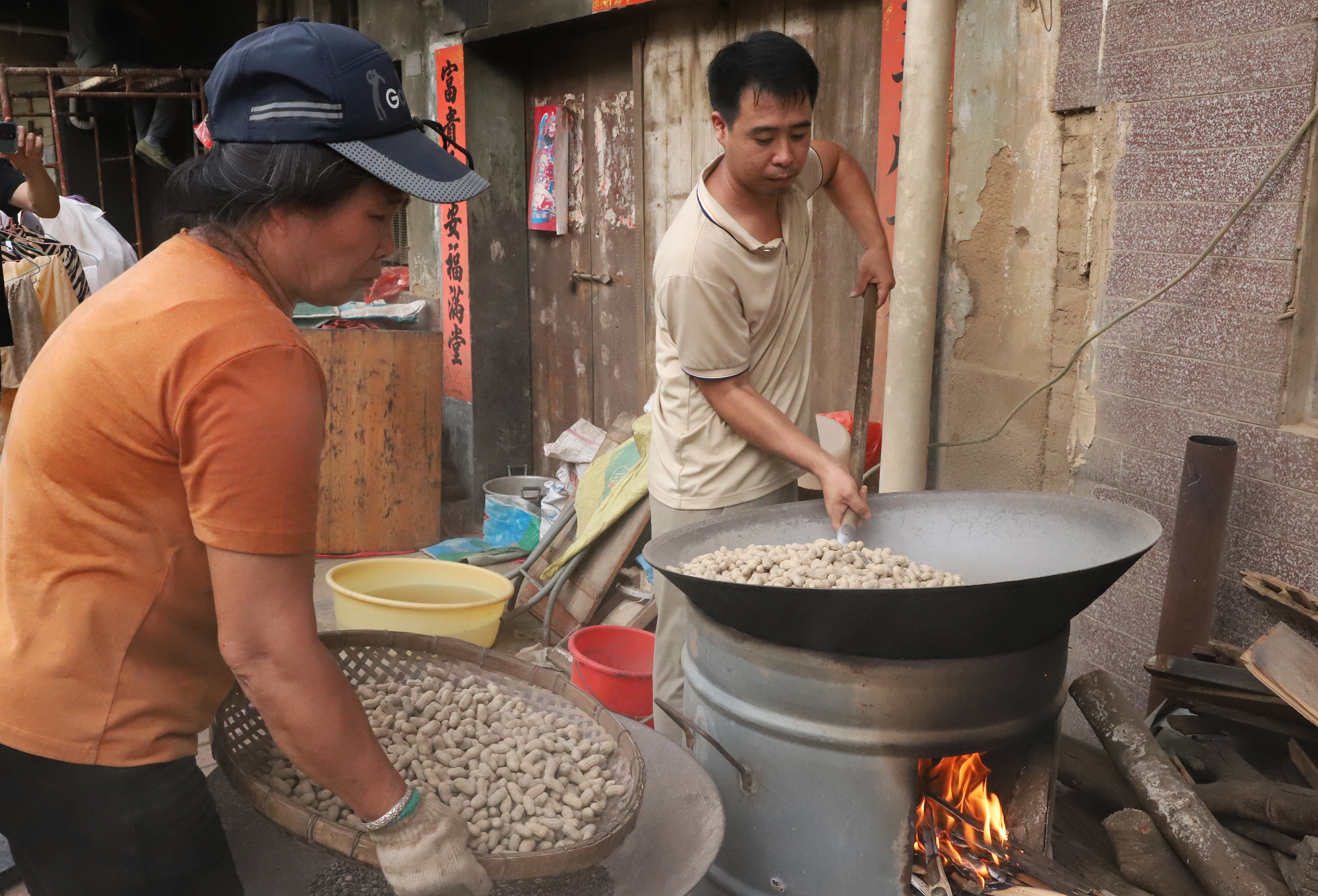 村民張仲文在鎮(zhèn)上租了個(gè)門面,和父母一起加工、售賣炒花生。每年7月,早造花生收成后,他們就開始忙碌了起來(lái):去地里跟農(nóng)戶收花生,回來(lái)再進(jìn)行二次篩選,然后用東江河砂炒制售賣。