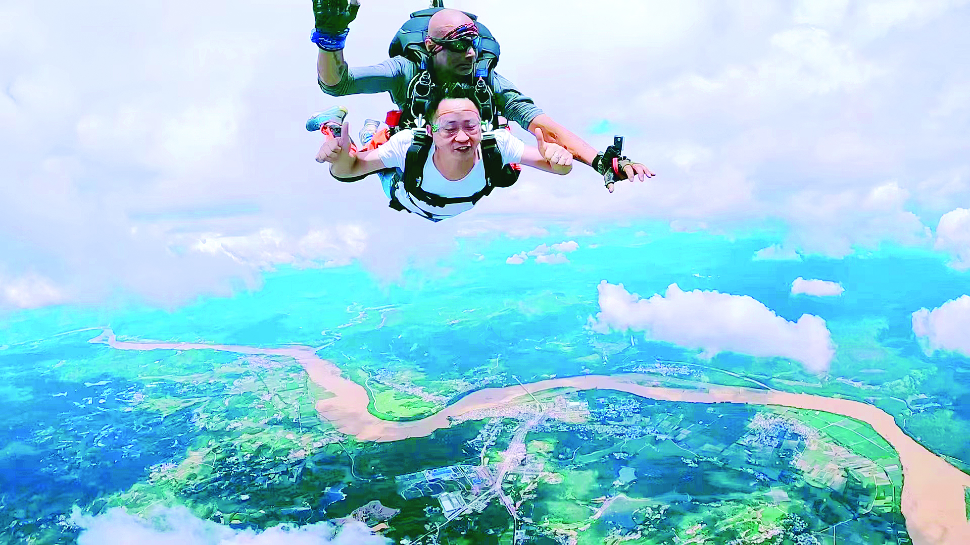 游人在觀音閣鎮(zhèn)體驗(yàn)高空跳傘。