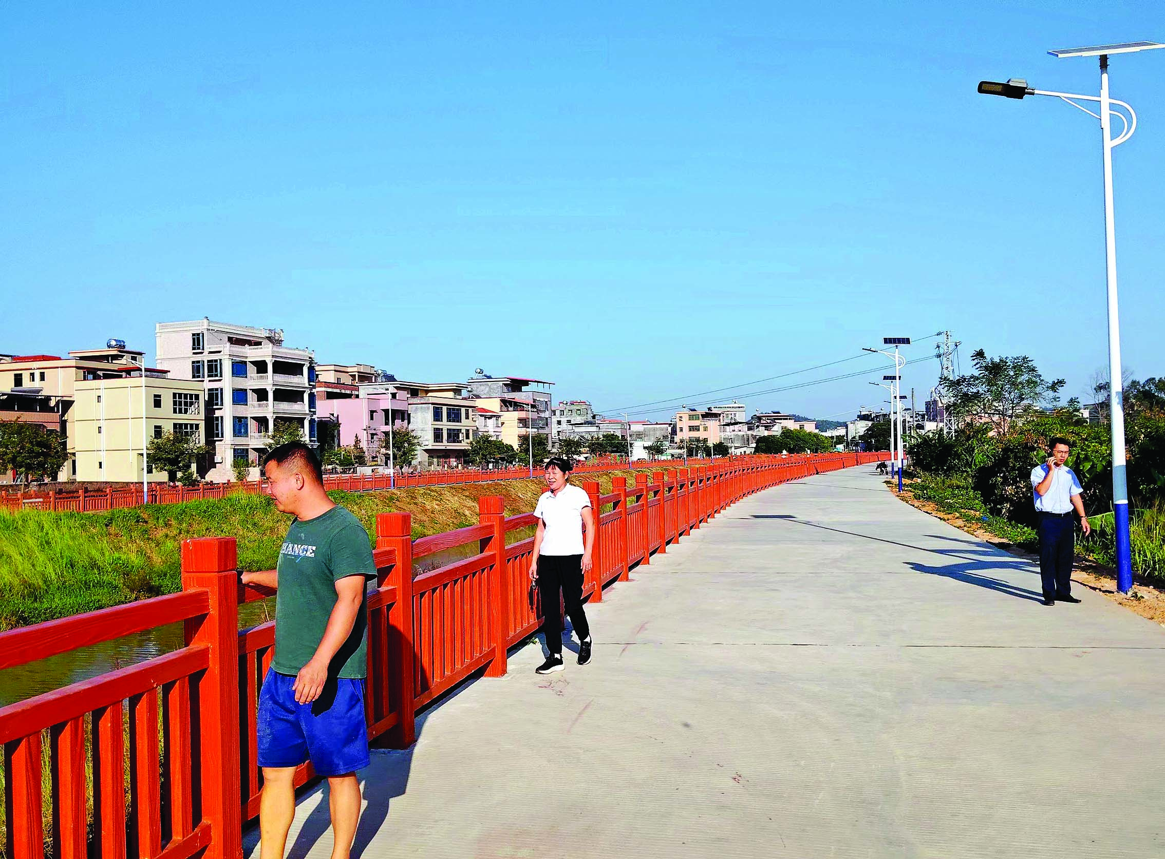 來到小鐵村山子村民小組,記者看到沿河修建的水泥路平坦又干凈,臨河的路邊安裝了橙黃色的護(hù)欄,另一邊則裝上了太陽能路燈。傍晚時分,三三兩兩的村民在村道上散步,悠閑又愜意。然而,這條步道就在4個月前,還是一條坑洼不平的土路。