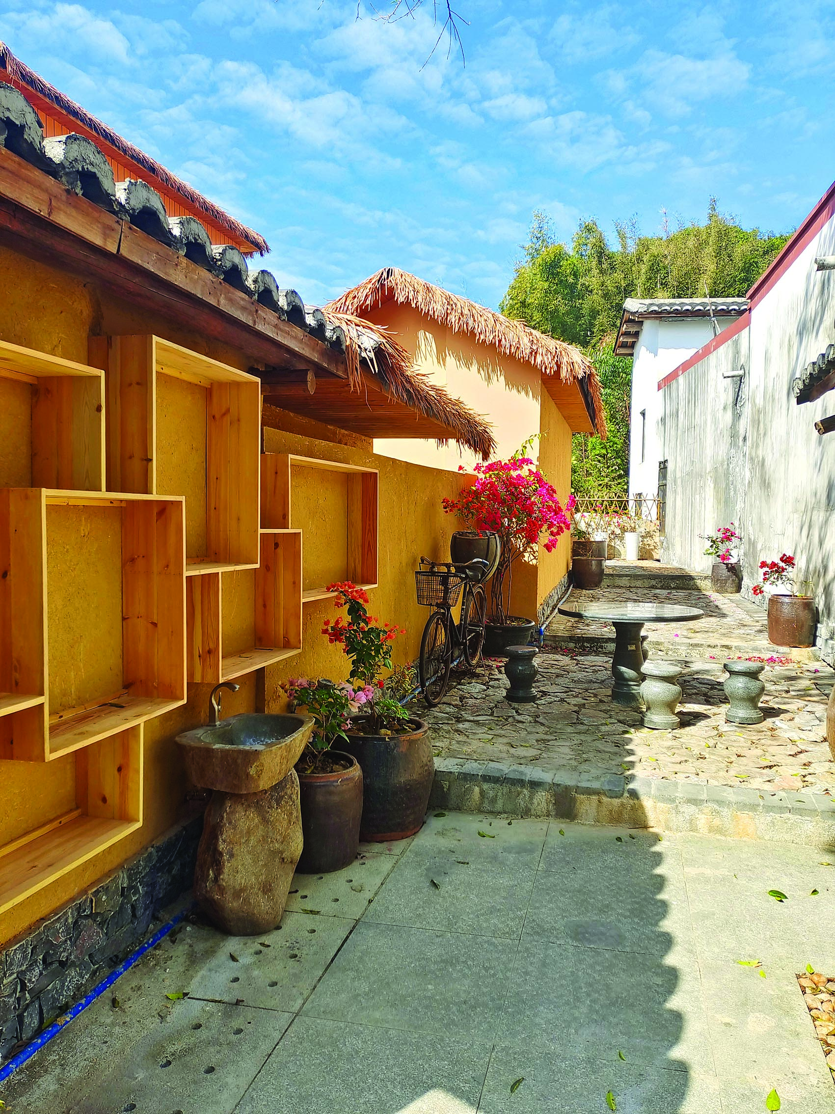 眼前這座綠植花卉與人文氣息相融的特色庭院,誰曾想到前身竟是菜園和雞圈。“我們將原來農(nóng)舍的工具房改造成眼前的咖啡館。菜園則打造成一座愜意庭院,作為游客來百果里喝咖啡和圍爐煮茶的打卡點(diǎn)。”百果里項(xiàng)目負(fù)責(zé)人陳海強(qiáng)介紹,為增添庭院人文自然氛圍與鄉(xiāng)土氣息,在建設(shè)過程中,園子里移栽種植了富有鄉(xiāng)土氣息的桂花樹、柿子樹以及常年開花的三角梅。配合青磚土瓦做成圍墻和入口,老舊石條鋪設(shè)的道路以及頗有古韻的木板雕刻成匾,都為庭院風(fēng)光增添了濃濃鄉(xiāng)愁。