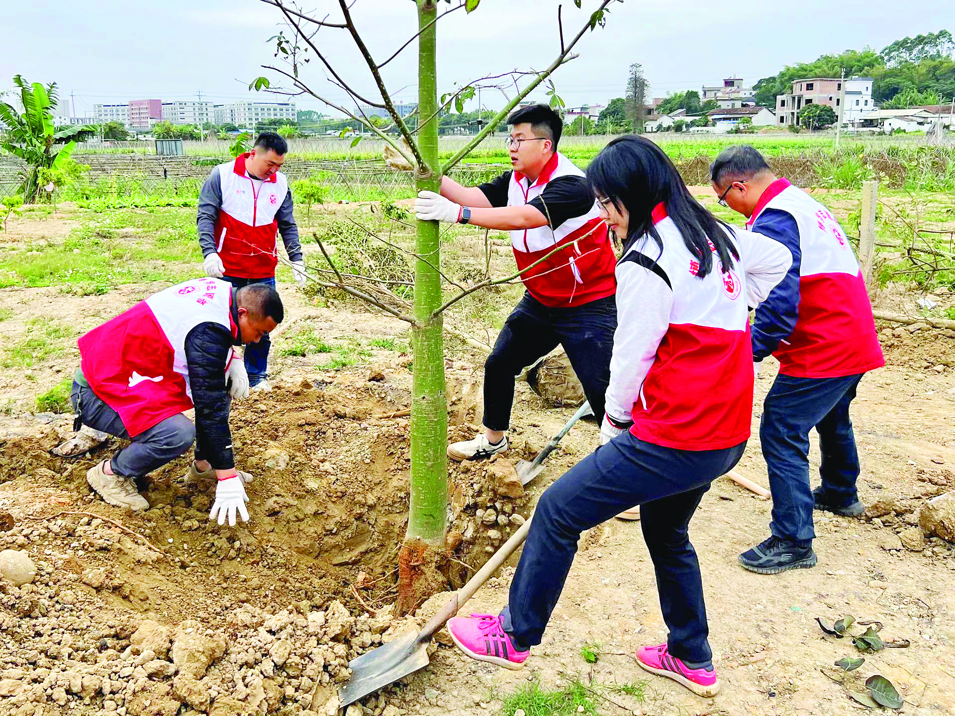 春節(jié)復(fù)工后第四天,2月21日下午,博羅縣羅陽街道蓮湖村的植樹點(diǎn)迎來近200名義務(wù)植樹志愿者。大家熱情高漲,揮鍬鏟土、扶正樹苗、培土澆水,活動(dòng)現(xiàn)場(chǎng)一派繁忙景象。經(jīng)過一番緊張而有序的勞作,一株株落羽杉苗木迎風(fēng)挺立。